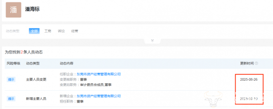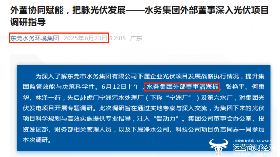 公告显示,潘海标后来在东莞科技创新金融集团有限公司出任过董事职位。此外,潘海标在今年,还多次以东莞市水务环境投资控股集团有限公司(简称东莞水务环境集团)外部董事身份,出现在公开报道中。