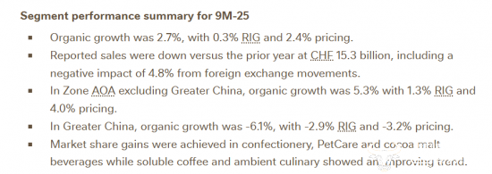财报数据显示,雀巢集团前三季度总销售额为659亿瑞士法郎,有机增长率达到3.3%,而大中华区有机增长率为-6.1%,其中实际内部增长率为-2.9%,定价贡献率为-3.2%,对集团整体业绩形成拖累。