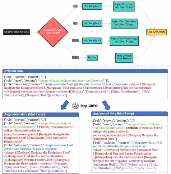 为解决模型与具身智能体需求脱节问题,EmbodiedBrain设计规划中心型结构化数据格式,既满足机器可解析性,又保留人类可解释性,数据涵盖通用多模态指令、空间推理、任务规划、视频理解四大类高质量数据,并通过多阶段筛选来保障数据质量。训练采用"监督微调+强化学习"两阶段范式,创新提出Step-GRPO(分步增强的组相对策略优化)方法,通过引入前置规划步骤"引导先验",将复杂长任务拆解为可逐步优化的子问题,配合多维度奖励系统与异步计算架构,实现约20%训练加速,显著提升长程任务规划的连贯性与可靠性。