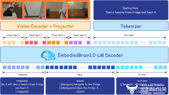 模型以Qwen2.5-VL为基础,创新采用模块化编码器-解码器架构,打通"感知-推理-行动"全链路。原生分辨率视觉Transformer凭借窗口注意力机制与二维旋转位置编码,精准捕捉图像细节与空间几何关系;轻量级MLP融合器高效对齐视觉与语言模态语义;基于Qwen2.5初始化的解码器引入时间对齐多模态ROPE技术,强化长视频时序理解能力。最终输出自然语言响应、分步规划与可执行动作序列的结构化结果,实现从语义理解到物理执行的直接闭环,对于"从冰箱取番茄并加热"这类任务可生成清晰的导航与操作步骤及对应动作指令。