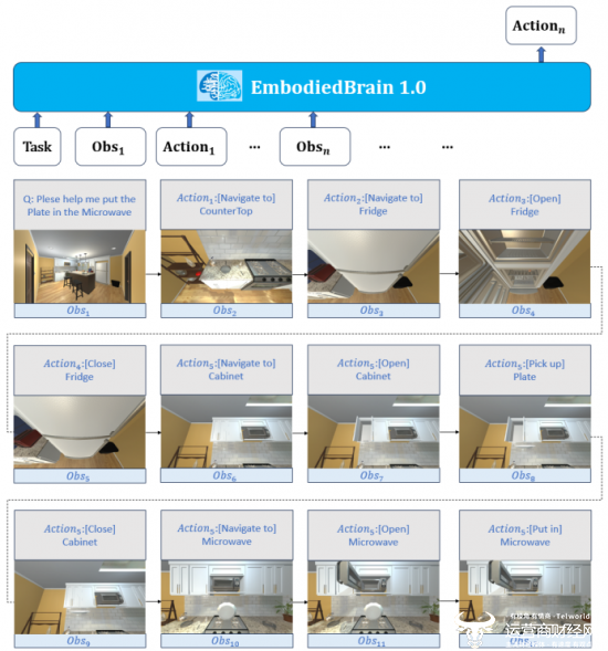 图 3:EmbodiedBrain 实时规划能力展示:“在开放的厨房中找到盘子并放入微波炉”