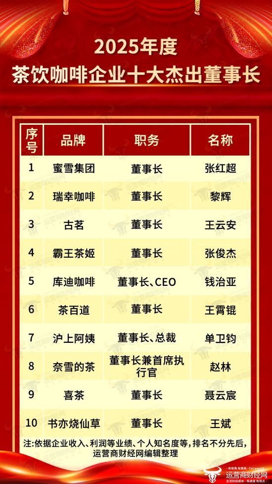 日前,由国内知名财经网运营商财经网独家打造的“2025年度茶饮咖啡十大杰出董事长”榜单正式公布,接下来运营商财经网将一一揭晓。