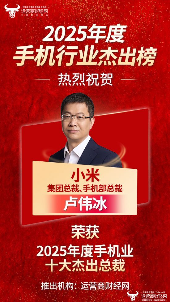 运营商财经网独家打造的“2025年度手机业十大杰出总裁”榜单已经揭开帷幕,小米集团总裁、手机部总裁卢伟冰榜上有名,可喜可贺。