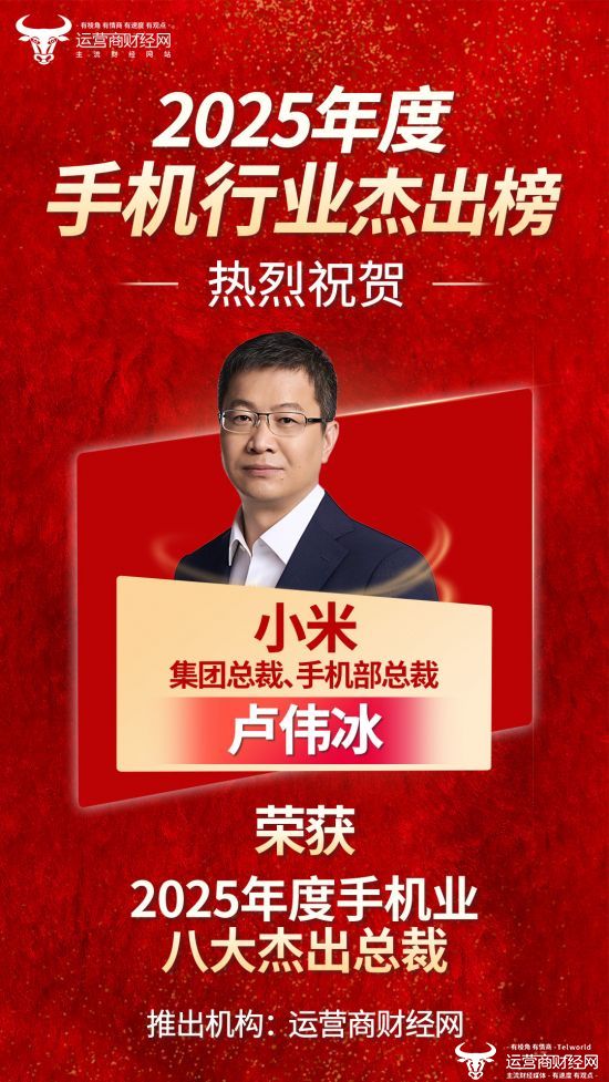 运营商财经网独家打造的“2025年度手机业八大杰出总裁”榜单已经揭开帷幕,小米集团总裁、手机部总裁卢伟冰榜上有名,可喜可贺。