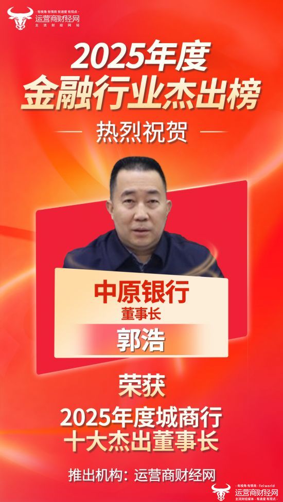 其中,中原银行董事长郭浩成功上榜“2025年度城商行十大杰出董事长”榜单。据了解,2025年中原银行聚焦“两高四着力”,围绕“打造一流城商银行、当好金融豫军排头兵”目标,坚持“做优政府银行、做实产业银行、做强市民银行、做大乡村振兴银行”的战略方向,经营指标持续向好。