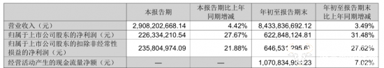 财报数据显示,新希望乳业前三季度营业收入为84.34亿元,同比增长3.49%。归母净利润为6.23亿元,同比增长31.48%。其中第三季度单季度公司营收为29.08亿元,同比增长4.42%,归母净利润同比上涨27.67%至2.26亿元,营收和利润双双增长,保持了业绩的增长态势。
