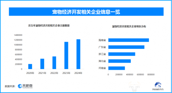 天眼查专业版工商信息数据显示,截至目前我国现存在业、存续状态的宠物经济相关企业超531.1万家。其中,2025年截至目前新增注册相关企业约142.1万余家,从企业注册数量趋势来看,近五年间,宠物经济相关企业的注册数量呈现出逐年增长的态势,并在2024年达到顶峰。从区域分布来看,海南省、广东省、浙江省宠物经济相关企业数量位居前列,分别为超76万余家、67.6万余家和50.2万余家。排在其后的是湖北省与河南省。