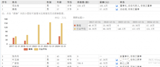 而过往财报显示,秦海2024年薪酬为57.18万元,相较于2023年的10.30万元,增长了46.88万元,是公司薪酬增长最多的,但仍低于副总经理杨照兵,后者薪酬为84.61万元。