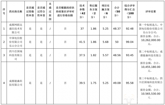 在三位中标候选人中,乐山电信与乐山移动的联合体不仅技术分最高,报价也是最低的。最终,该联合体以双重领先的优势,毫无悬念地拿下中标资格。