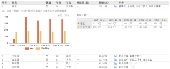 此外值得一提的是,谢宏去年薪酬为365.1万元,相较于2023年的371.5万元,下降了6.4万元,但其仍为公司高管中唯一薪酬超百万的,其他高管成员薪酬大多都在40至90万元左右,可见谢宏薪酬在公司为断层领先状态。