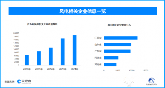 从区域分布来看,江苏省、山东省、广东省风电相关企业数量位居前列,三个省市数量总和超过3.1万余家,占企业总数的29.35%。