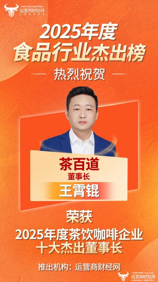 近日,运营商财经网正式推出“2025年度茶饮咖啡十大杰出董事长”榜单,其中茶百道董事长王霄锟成功入围!