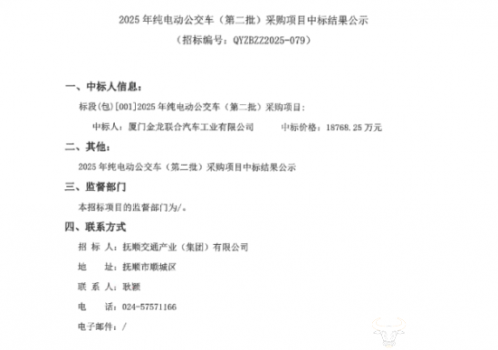 据中国招标投标公共服务平台显示,抚顺交通产业(集团)有限公司于今年8月启动的“2025年纯电动公交车(第二批)采购项目”已完成招标。据悉,该项目总预算超1.89亿元,接下来试图揭秘具体情况。