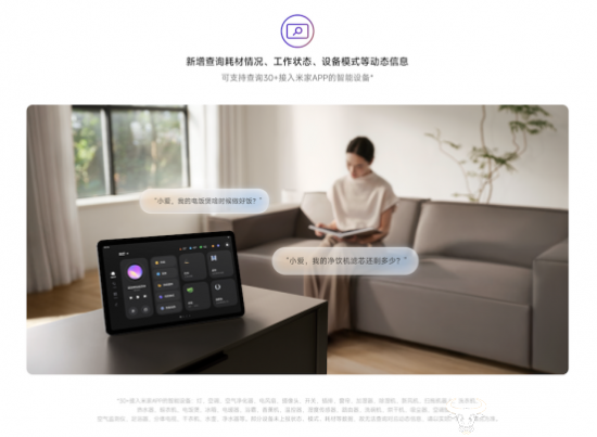 作为全屋智能家居的中枢设备,Xiaomi 智能家庭屏 11 支持一句话了解各种设备的工作状态和使用方法,比如“卧室的灯开着吗?”、“净水器的滤芯还剩多少?”30+个类别、6000+个型号的设备,都能通过米家平台将自身的工作状态、模式等信息共享给「超级小爱」