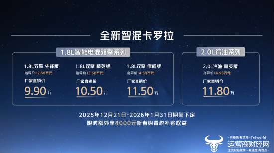12月21日,“全球好品质 中国新家轿”全新智混卡罗拉焕新上市,共推出4个版本,厂商直销价为:9.9万元-11.8万元。即日起至1月31日期间下定,限时额外享受4000元新春购置税补贴权益。