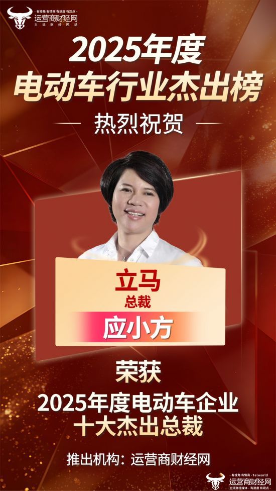 日前,运营商财经网正式揭晓“2025年度电动车十大杰出总裁”的具体名单。经过多方面的考量,立马总裁应小方凭借优秀的表现成功入选。
