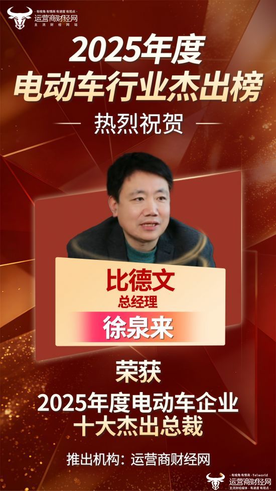 行至年末,运营商财经网回顾了过去一年电动车行业的整体发展情况,推出了“2025年度电动车十大杰出总裁”。其中,比德文总经理徐泉来荣获此奖。