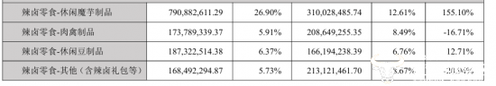 财报数据显示,卫龙今年上半年实现总营业收入34.83亿元,同比上升18.5%,期内利润为7.36亿元,同比增长18.5%。其中以魔芋爽为代表蔬菜制品实现收入21.09亿元,同比增长44.3%,营收占比也从49.7%增至60.5%。