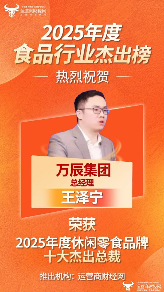 近日,由运营商财经网独家编制的“2025年度休闲零食品牌十大杰出总裁”名单正式揭晓,万辰集团总经理王泽宁成功入选!