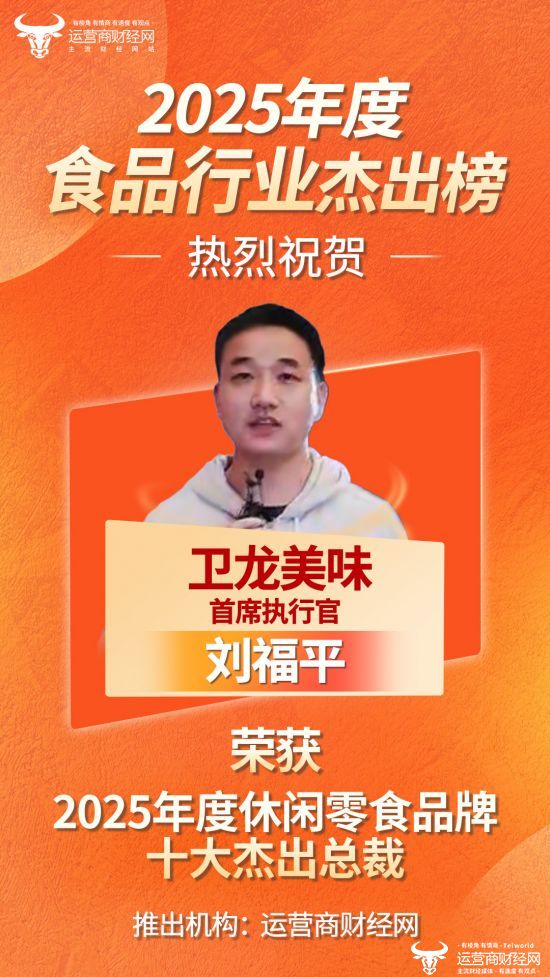 近日,运营商财经网正式推出“2025年度休闲零食品牌十大杰出总裁”榜单,卫龙首席执行官刘福平成功入选!