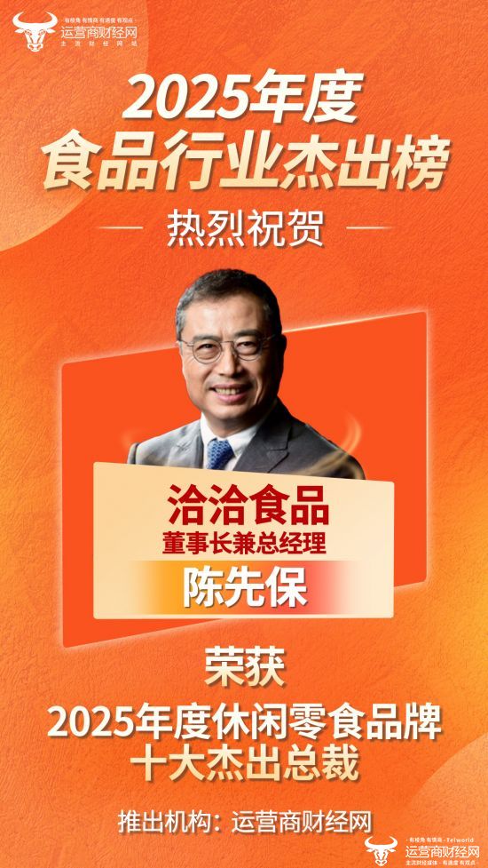 日前,由运营商财经网独家打造的“2025年度休闲零食品牌十大杰出总裁”名单正式推出,洽洽食品董事长兼总经理陈先保成功入选!