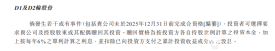 但这两位投资方与溜溜果园签署了一份协议,即若溜溜果园未于2025年12月31日前未能成功上市,投资者可选择要求公司及控股股东或其配偶,也就是创始人杨帆及其夫人李慧敏赎回其投资,而赎回价格为投资方投资本金加上每年6%的单利计算利息。