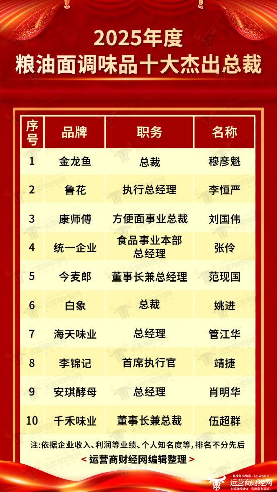 因此,此次推出的“2025年度粮油面调味品十大杰出总裁”均为细分领域头部企业,拥有独特的核心竞争力,且综合考虑企业多方面的发展情况,包括企业在2025年的营收、利润等业绩情况,以及总裁在行业内的名气等诸多因素,保证榜单的客观与公正。