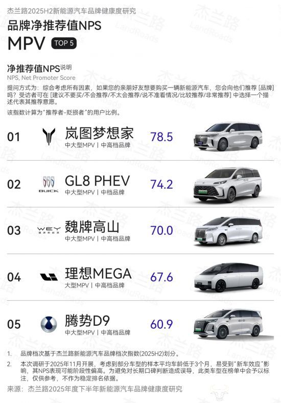 1月10日数据显示,岚图梦想家在2025年下半年销量为43191台,再次蝉联高端MPV第一,2025全年达到80248台,同比增长46%。另据杰兰路发布的《2025年度下半年新能源汽车品牌健康度研究(NPS篇)》,岚图梦想家在2025年下半年以78.5分的净推荐值(NPS)位居新能源MPV榜首。作为豪华旗舰MPV,岚图梦想家在2024年、2025年连续蝉联MPV用户净推荐值第一,成为销量与口碑的“双料冠军”,持续引领中国高端MPV。