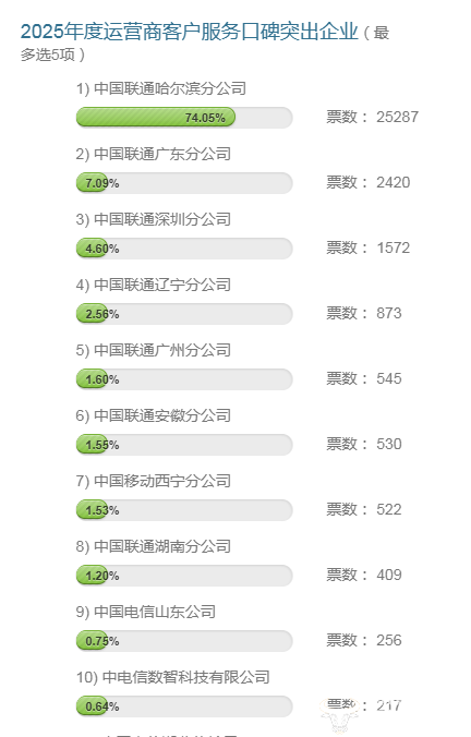 日前,国内知名运营商媒体运营商财经网举办的一年一度财经TMT“领袖榜”评选活动,已经开启投票,得到了广泛关注。其中“2025年度运营商客户服务口碑突出企业”一奖备受瞩目,哈尔滨联通位列第一,广东联通和深圳联通位列二三。武汉联通暂列最末。