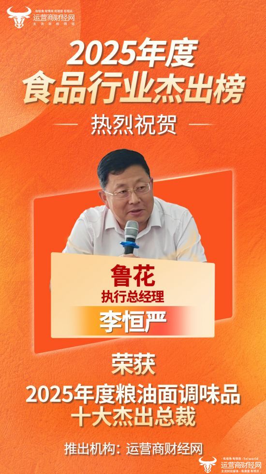 近日,由运营商财经网独家编制的“2025年度粮油面调味品十大杰出总裁”名单正式揭晓,鲁花执行总经理李恒严成功入选!