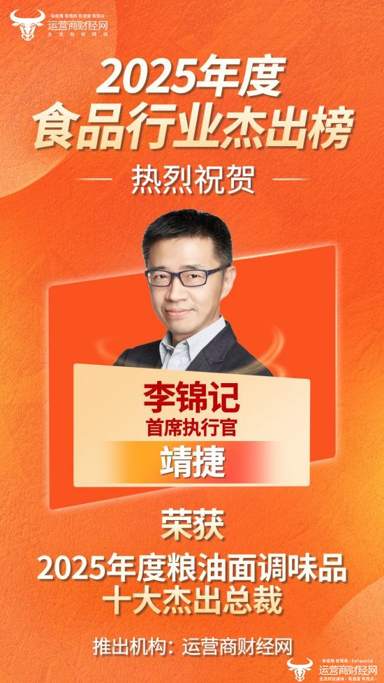 近日,运营商财经网独家打造的“2025年度粮油面调味品十大杰出总裁”正式揭晓,李锦记首席执行官靖捷成功上榜!