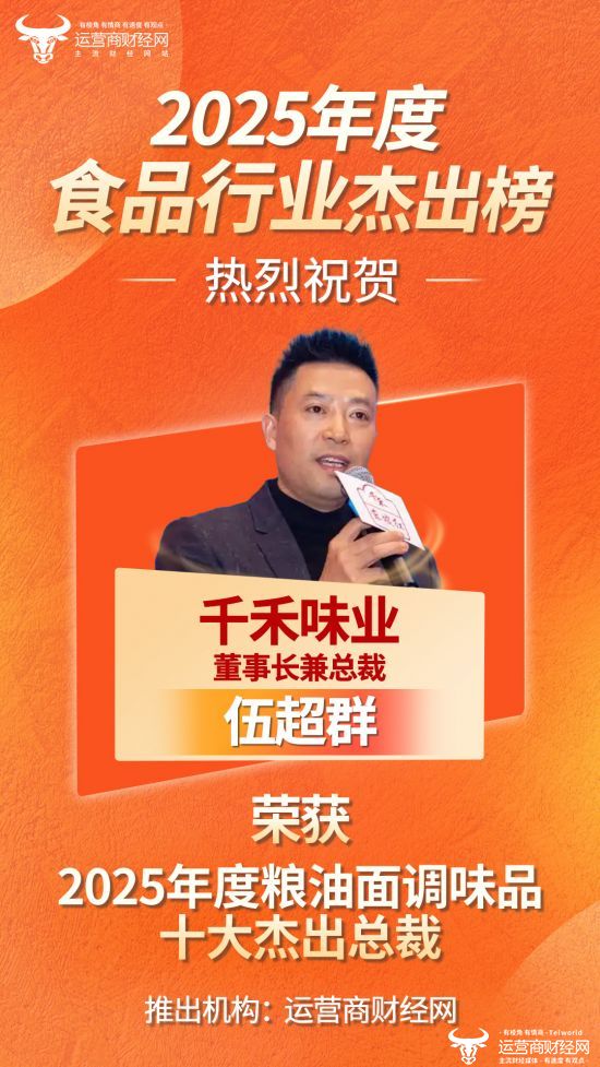 日前,运营商财经网独家打造的“2025年度粮油面调味品十大杰出总裁”榜单正式推出,千禾味业董事长兼总裁伍超群成功上榜!