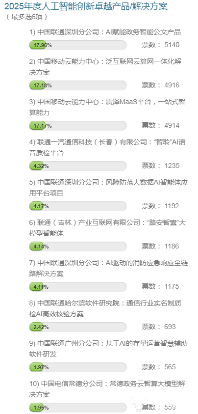 中国联通哈尔滨软件研究院的“通信行业实名制质检AI高效核验方案”、广州联通的“基于AI的存量运营智慧辅助软件研发”以及常德电信的“常德政务云智算大模型解决方案”紧随其后,跻身前十。