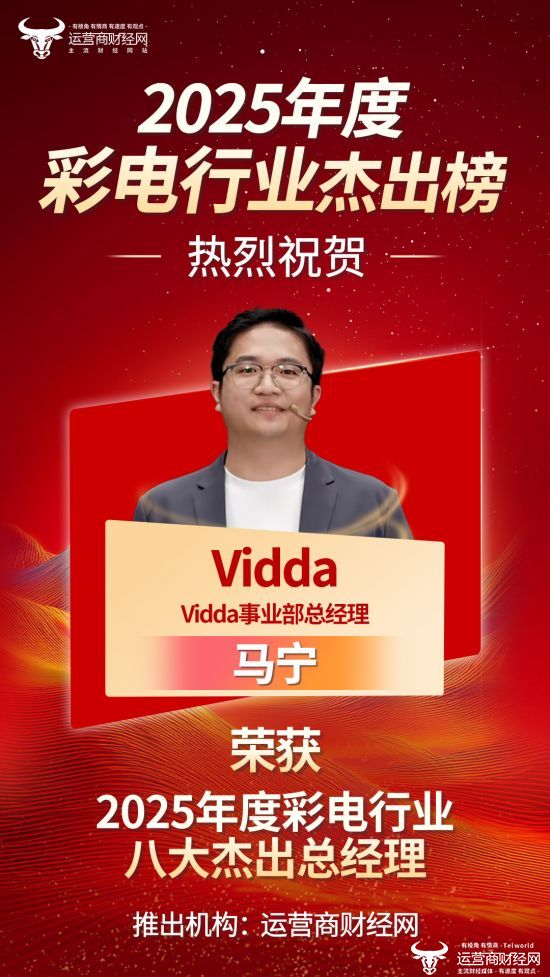 日前,运营商财经网独家打造的“2025年度彩电行业八大杰出总经理”终于正式揭晓。经过多方考量,Vidda事业部总经理马宁凭借优秀的表现成功入选。