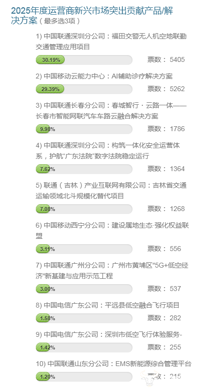 接着长春联通的“春城智行·云路一体——长春市智能网联汽车车路云融合解决方案”、深圳联通的“构筑一体化安全运营体系,护航‘广东法院’数字法院稳定运行”以及吉林产互的“吉林省交通运输领域北斗规模化替代项目”也分别位列第三、四、五名,且票数较为相近。