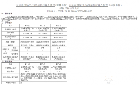 日前,“东风本田2026-2027年传统媒介代理”中标结果出炉。值得注意的是,前不久东风本田刚花了7000多万采购公关传播代理服务,这意味着东风本田已经花费1亿多采购媒体投放和公关服务!