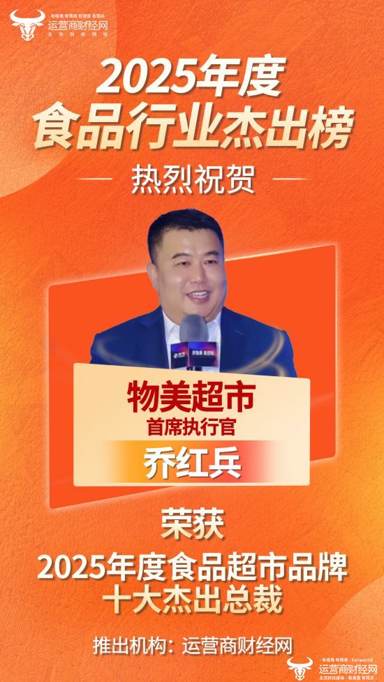 近日,由国内知名财经媒体运营商财经网独家编制的“2025年度食品超市品牌十大杰出总裁”榜单正式公布,物美超市首席执行官乔红兵平成功入选!