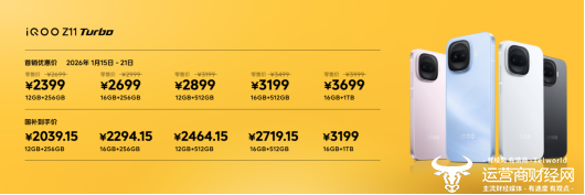 iQOO Z11 Turbo将于2026年1月15日正式开售,提供12GB+256GB、16GB+256GB、12GB+512GB、16GB+512GB、16GB+1TB五种存储版本,在1月15日~21日的首销期内下单,可享受300元官方优惠,叠加国补后累计最多立减800元,具体如下: