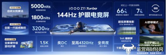 iQOO Z11 Turbo配备6.59英寸1.5K 144Hz护眼电竞屏,支持类DC调光、至高4320Hz超高频调光、全亮度类DC调光三重护眼方案,通过SGS硬件级低蓝光与低频闪认证,实现全天候、全人群、全场景护眼。