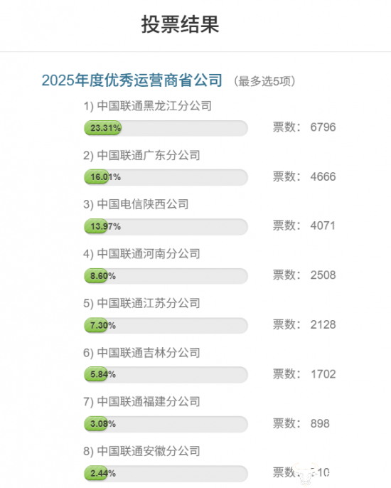 由运营商财经网主办的2026中国财经TMT“领秀榜”评选活动正如火如荼地进行中,其中“2025年度优秀运营商省公司”奖项竞争尤为激烈,下面公布该奖项目前的投票结果。