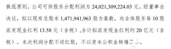 公告显示,截至2025年三季度,泸州老窖可供股东分配利润约为240.21亿元。经公司董事会决议,拟向全体股东每10股派发现金红利13.58元(含税),合计共派发现金红利约20亿元。