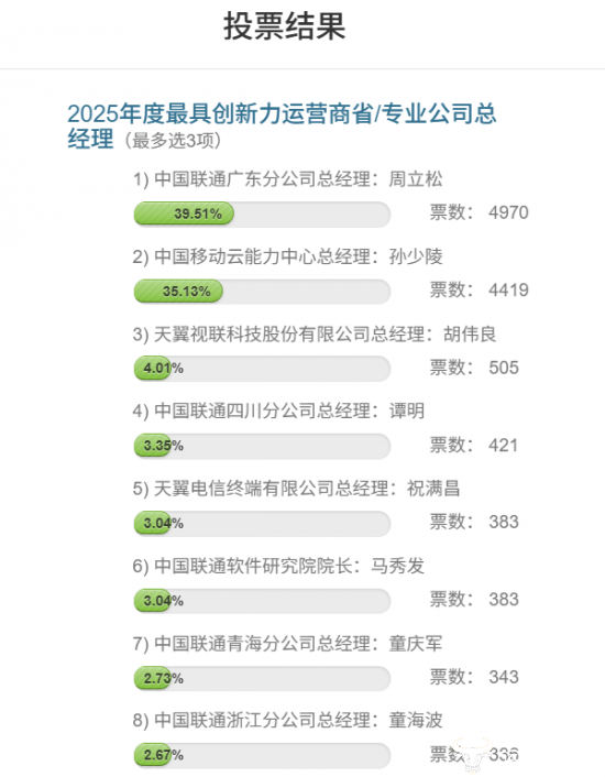 投票结果显示,截至1月14日15时30分,广东联通总经理周立松以4970的票数暂居第一,中国移动云能力中心总经理孙少陵紧随其后,以微弱的差距位列第二名,二人票数极为接近,排名随时有可能发生变化。
