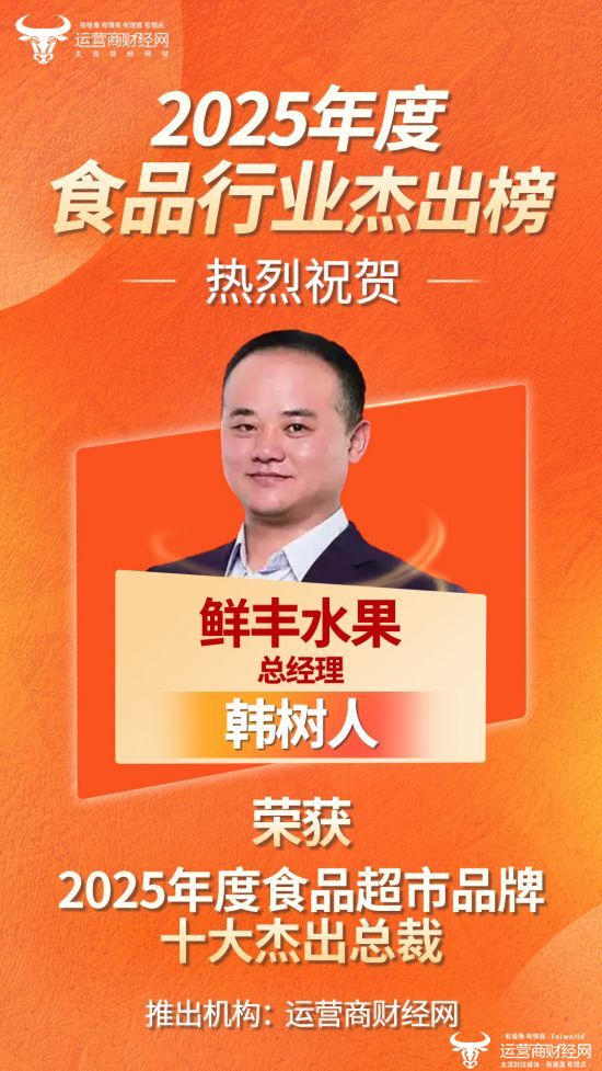 近日,由运营商财经网独家编制的“2025年度食品超市品牌十大杰出总裁”名单正式公布,鲜丰水果董事长兼总经理韩树人成功入选!