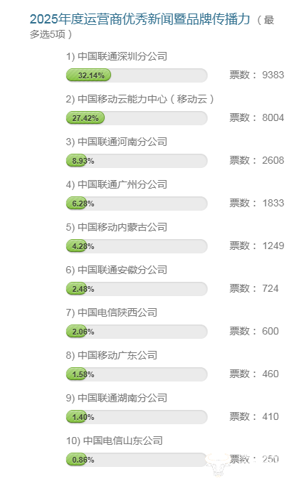 同时,安徽联通、陕西电信、广东移动、湖南联通和山东电信等多家公司也以较小的票数差距分列六至十位,正在持续追赶。