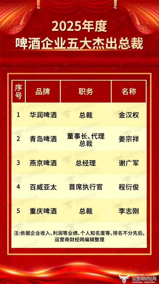 日前,由国内知名财经网运营商财经网独家打造的“2025年度啤酒企业五大杰出总裁”榜单正式公布,接下来运营商财经网将一一揭晓。