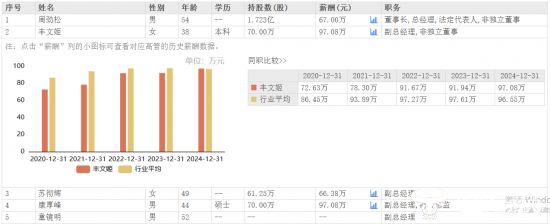 值得一提的是,丰文姬在2014年起就同时担任公司副总经理兼董事会秘书了,而当时她年仅26岁,其近五年薪酬分别为72.63万元、78.30万元、91.67万元、91.94万元、97.08万元,保持增长态势。其中在2024年,丰文姬薪酬为公司最高薪酬,比董事长周劲松还高,此次卸任董事会秘书后,不知她的薪酬会如何变化。