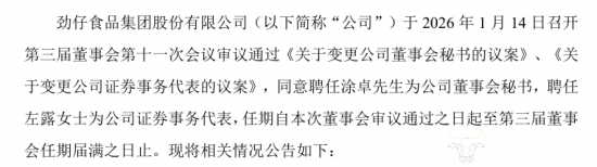 近日,劲仔食品核心管理层人员发生调动,涂卓获任为公司新任董事会秘书。