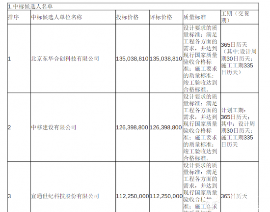 2026年1月9日,项目中标候选人公示,该项目共有7家投标人参与投标,东华合创、中移建设、宜通世纪三家进入中标候选人名单。