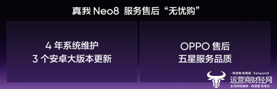 在强大产品之上,真我Neo8更提供"无忧购"服务保障。系统维护方面,真我Neo8承诺4年系统维护与3个安卓大版本更新,从大一用到大四,系统仍能保持流畅如新的使用体验。售后服务方面,真我手机将于今年4月全面接入OPPO售后服务体系,享受OPPO五星服务品质,包括面对面维修、可视化寄修服务、30天性能故障包换、维修部件至高180天质保等全方位保障,让用户买得放心、用得舒心。