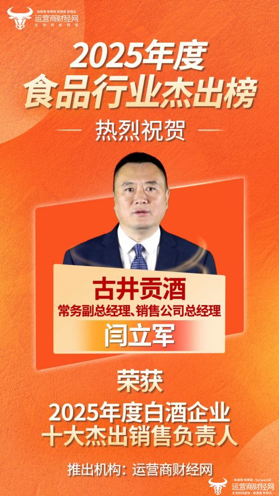近日,由运营商财经网独家打造的“2025年度白酒企业十大杰出销售负责人”名单正式公布,古井贡酒常务副总经理、销售公司总经理闫立军成功上榜!